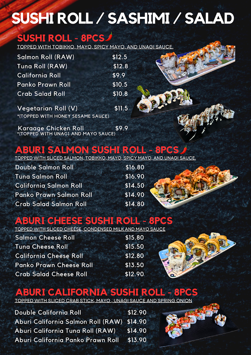 California and cucumber inside, top with seared ebi prawn, mayo and spicy mayo sauce