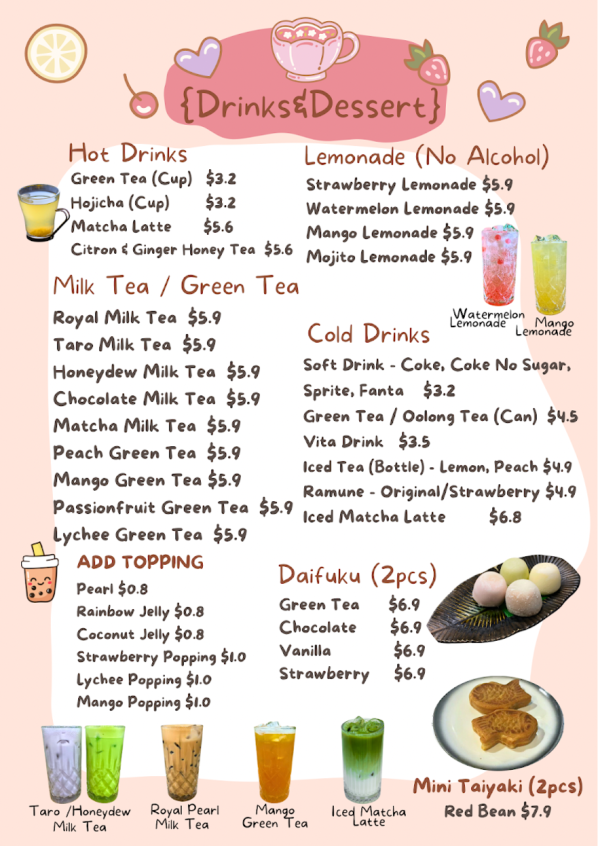 Salmon Roll +Salmon Sashimi+Tuna(6pcs)+Passionfruit Green Tea+Strawberry Popping